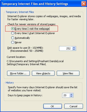 Click on "(*) Every time I visit the webpage" radio button in the "Temporary Internet Files and History Settings" window as shown in the image below